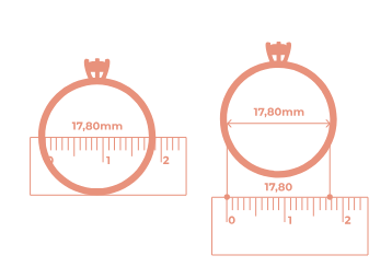 Nesse método tentaremos descobrir o diâmetro interno da aliança ou do anel. Nós devemos medir somente a parte interna da aliança/anel, em uma linha reta, de uma extremidade a outra, não precisa medir as bordas, mas somente a extremidade interna. Após obter a medida você deve utilizar a tabela abaixo para descobrir o tamanho de sua aliança.